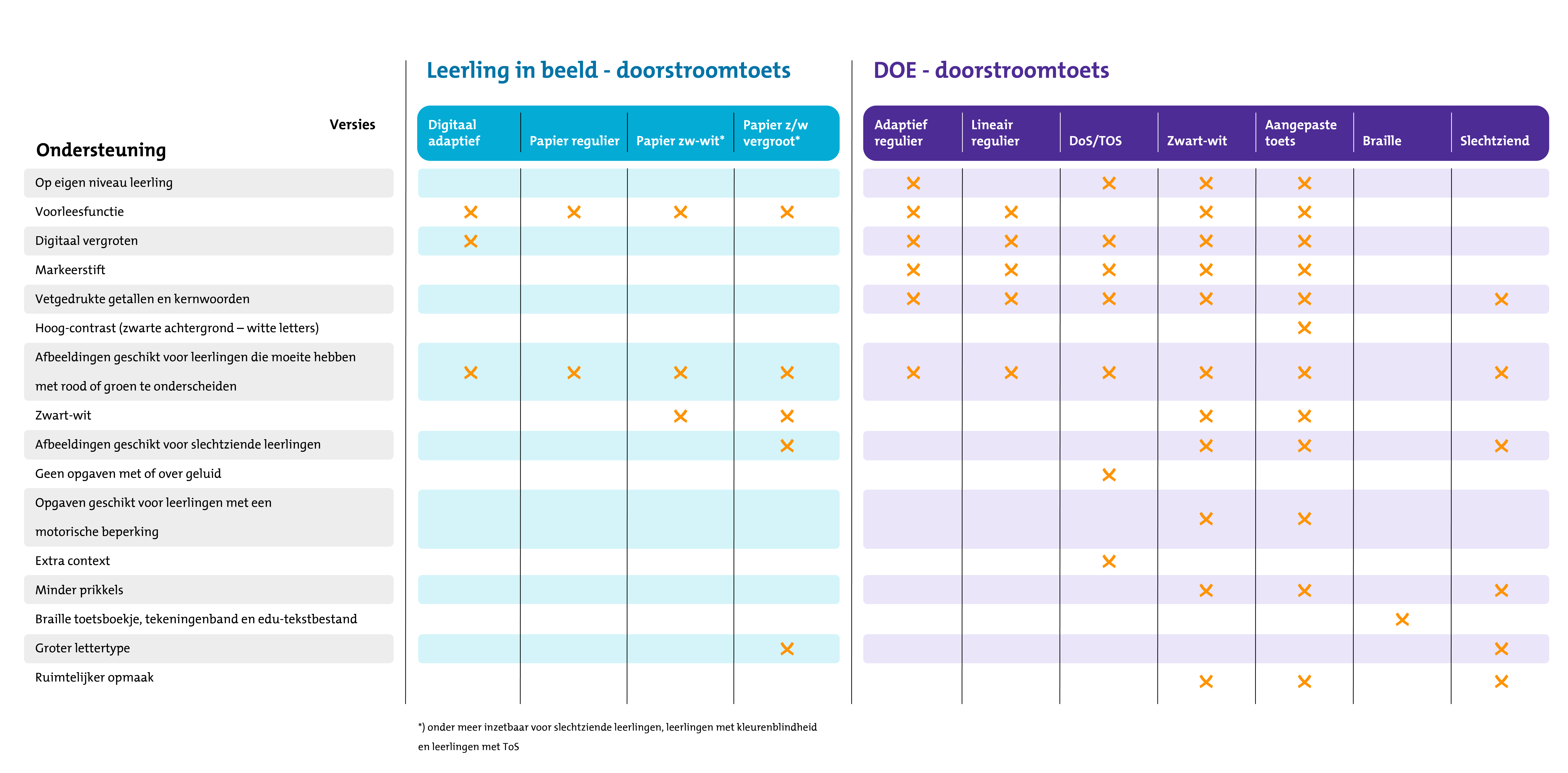 Onze organisatie is betrokken bij twee doorstroomtoetsen: de Leerling in beeld - doorstroomtoets van Cito BV en de overheidsdoorstroomtoets DOE die wordt ontwikkeld door Stichting Cito. Beide zijn uniek qua opzet, opmaak, inhoud, vorm en geboden ondersteuning. Wat wél overeenkomt is dat deze toetsen zijn ontwikkeld door ervaren experts, samen met het onderwijsveld en met oog voor de diversiteit in het klaslokaal. Want: niet elke leerling volgt dezelfde route naar hetzelfde inzicht.