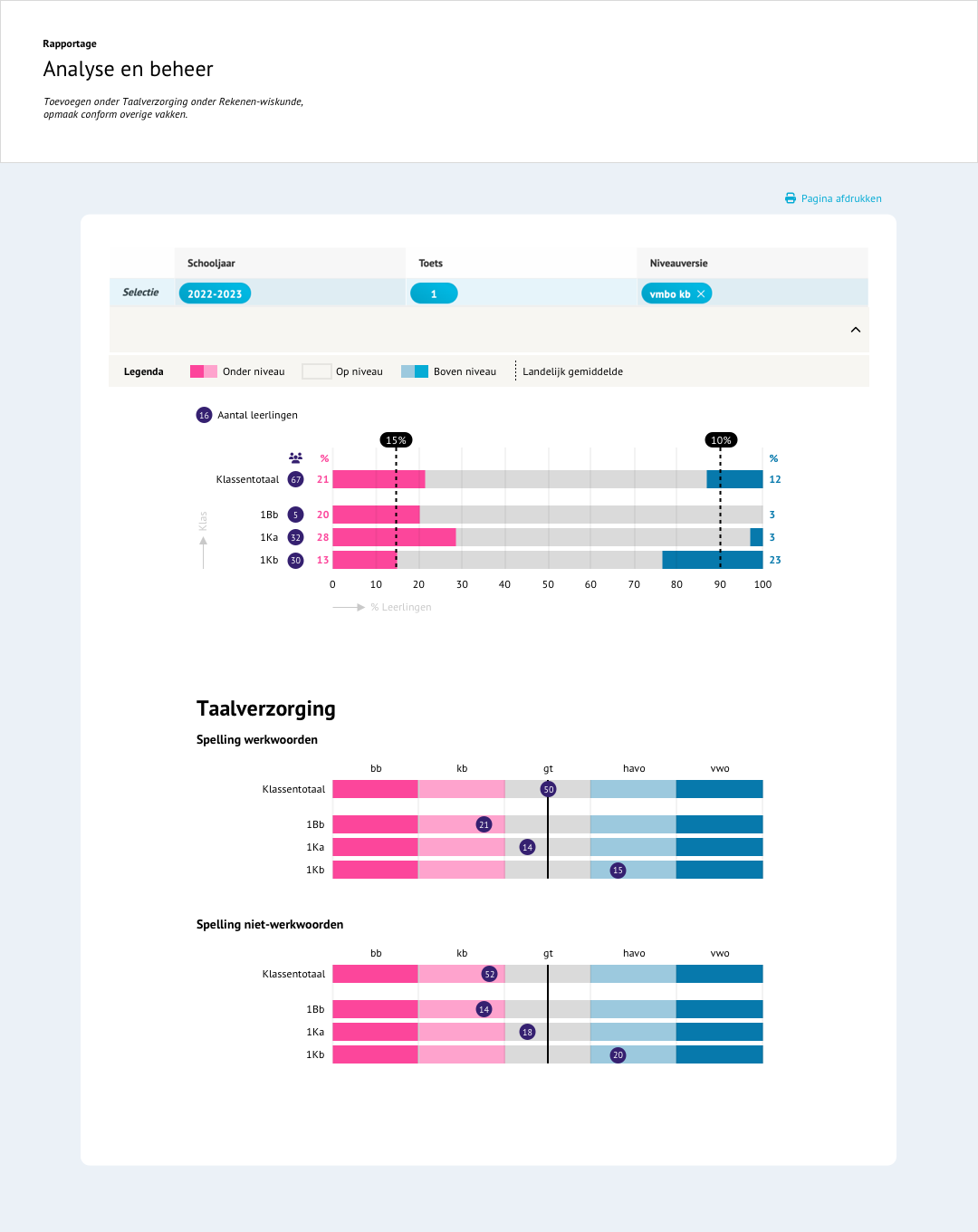 Heb je de basisvaardigheden van je leerlingen in kaart? Voor leesvaardigheid en woordenschat Nederlands krijg je inzicht met Toets 0, 1, 2 en 3. Maar ook voor taalverzorging bieden we ondersteuning. Wil je weten waar je leerlingen staan voor spelling werkwoorden en spelling niet-werkwoorden? De module Taalverzorging brengt dit in beeld.