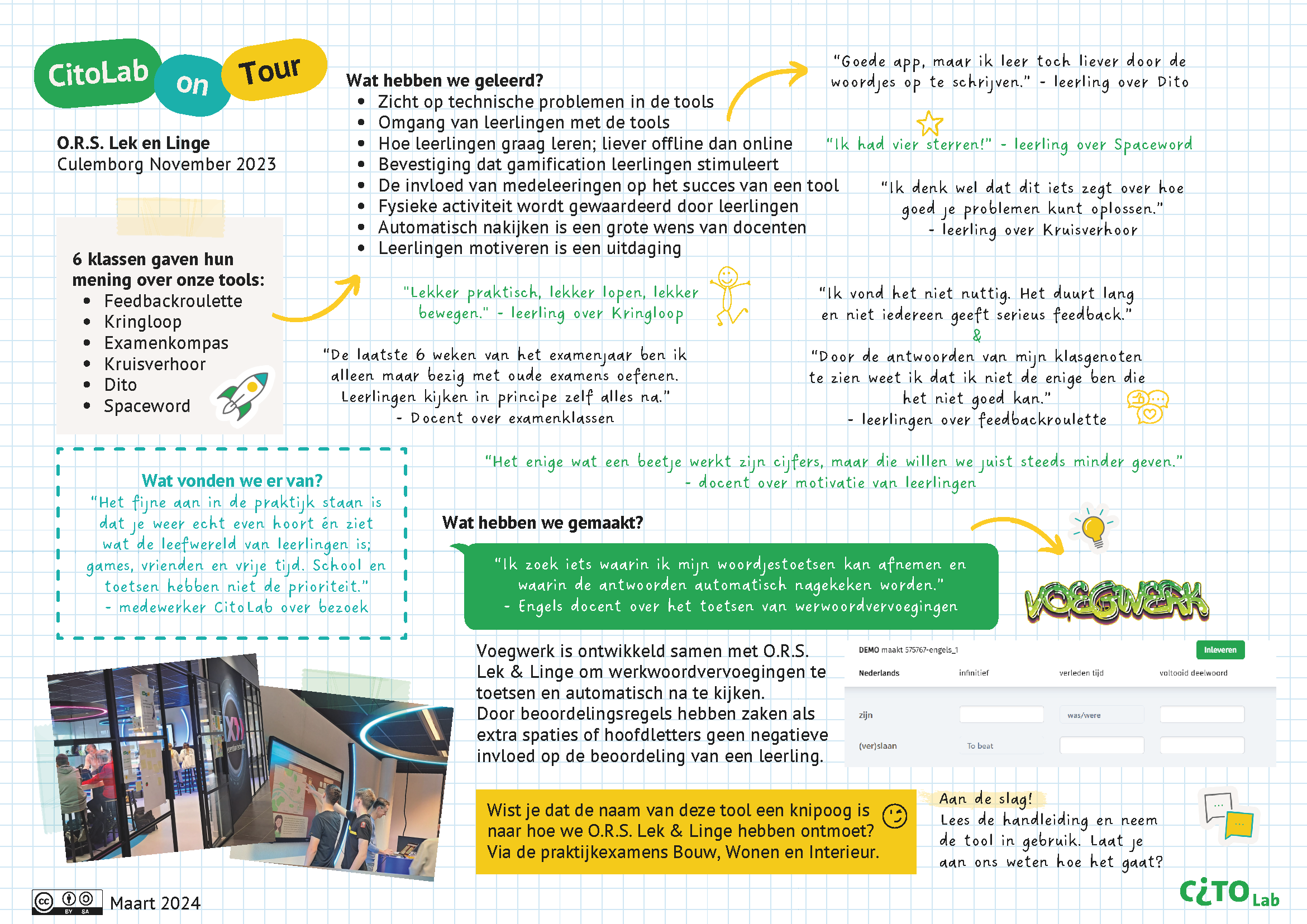 Bij CitoLab werken we regelmatig samen met scholen voor het valideren van prototypes of voor onderzoeken. Met CitoLab on tour zetten we een stapje dichter bij de praktijk. Hoe? Door met een multidisciplinair team meerdere dagen op een school te werken: vraagstukken ophalen én direct samen oplossingen verkennen.